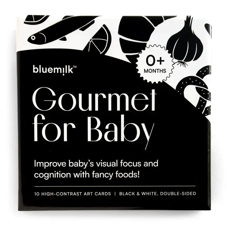 Bold, high-contrast designs captivate babies, nurturing their sight, fostering focus, and stimulating brain development. Growing alongside, gourmet food cards introduce colors and shapes, while names and poems foster verbal development as they get older.
