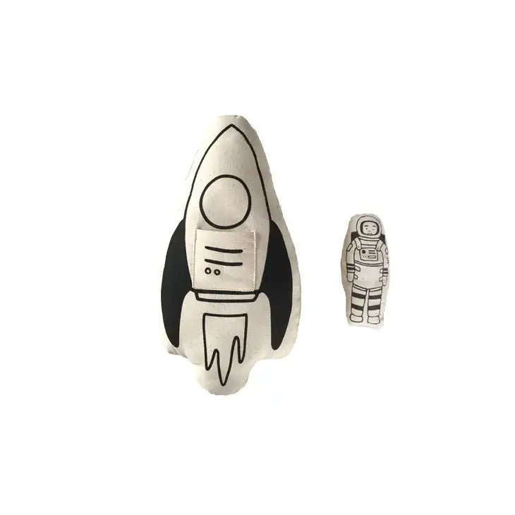 - Rocket includes 1 soft canvas, screen printed rocket pillow and 1 mini plush astronaut