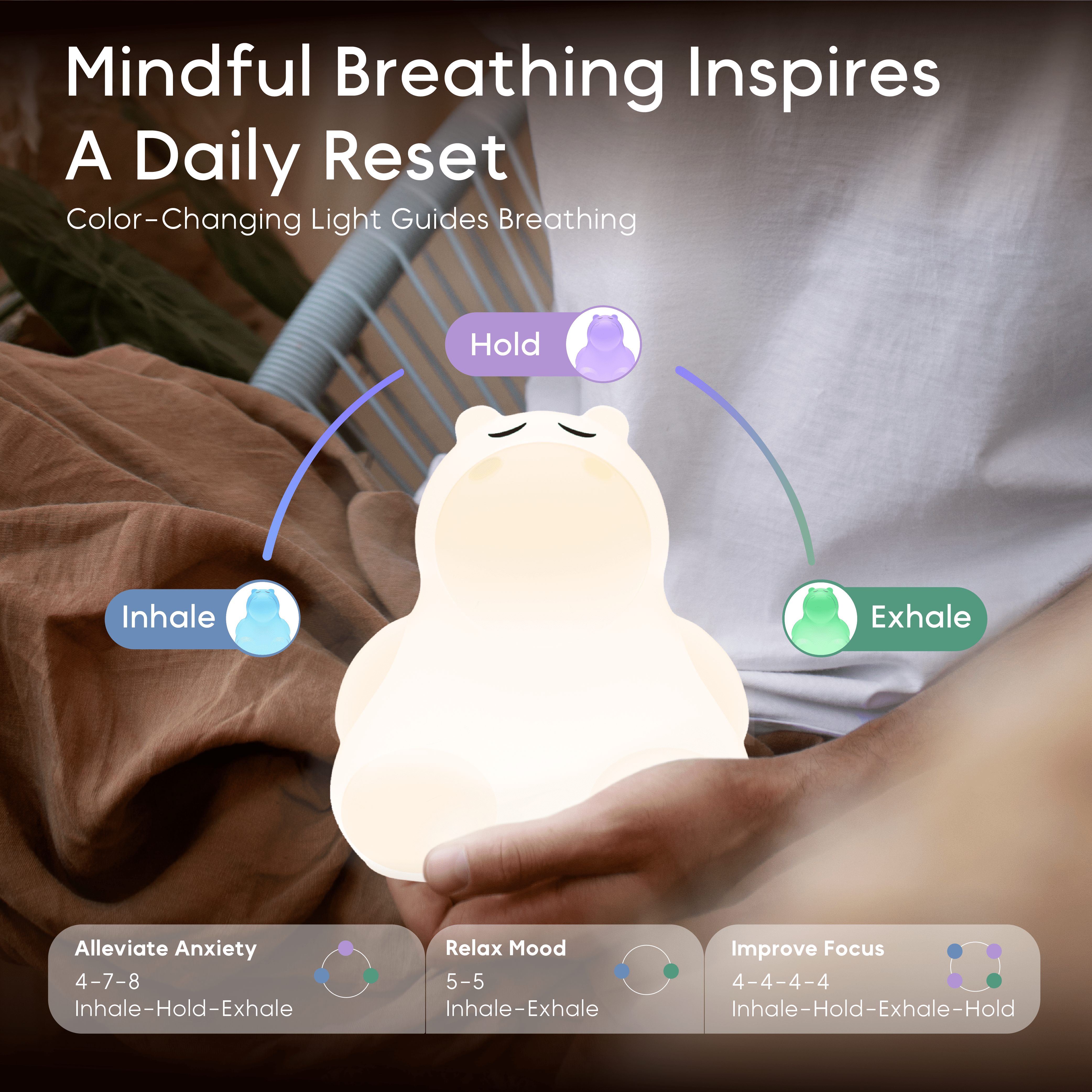 - Offers three different breathing techniques, the 4-7-8 breathing for alleviating anxiety relief, the 4-4-4-4 box breathing for focus, or the 5-5 breathing for relaxation.