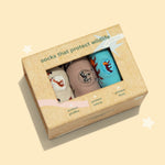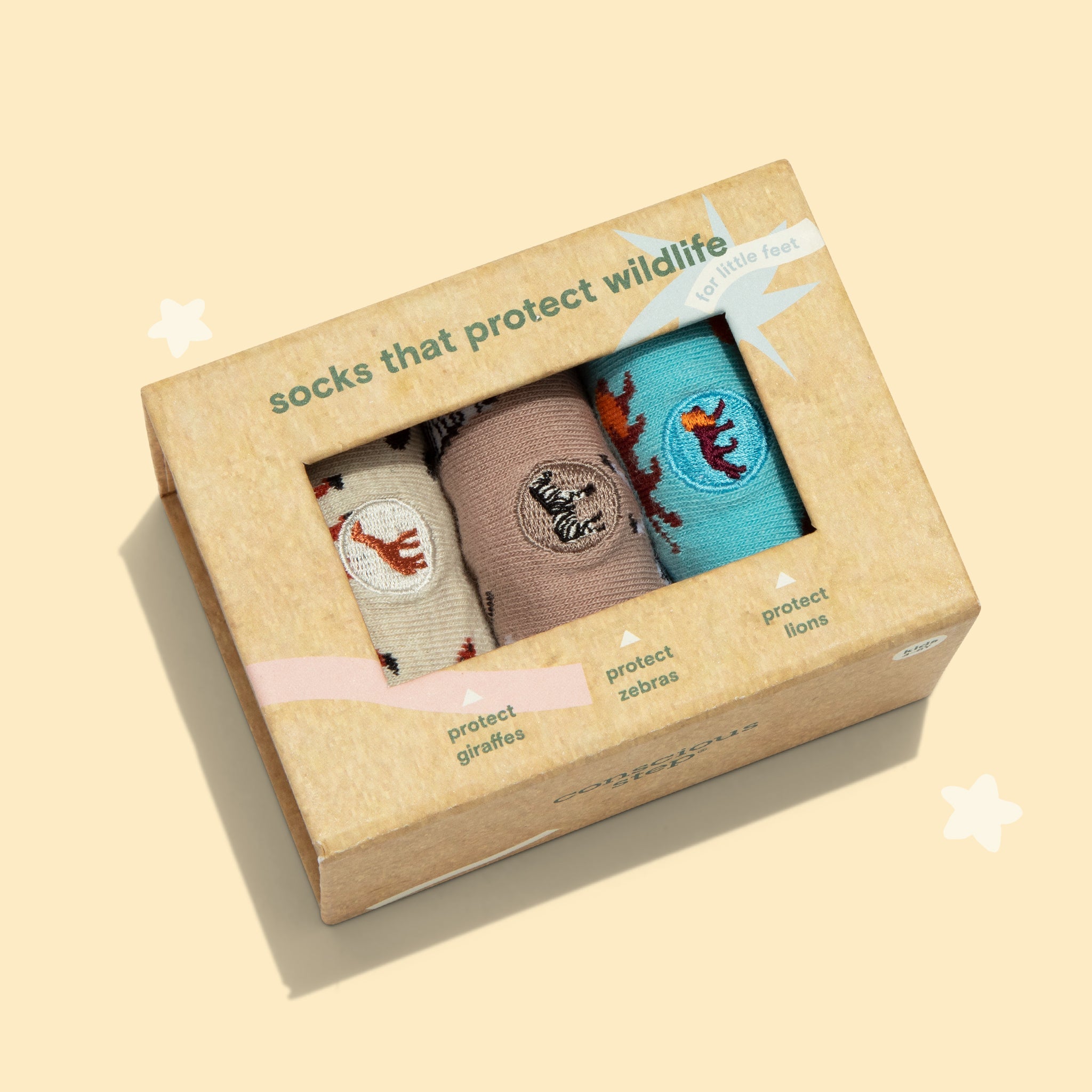 Lions and giraffes and zebras, oh my! These wild socks that protect safari animals are a great opportunity for your kid to wear their favorite animal and learn about animal conservation.