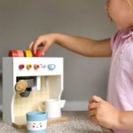 - Includes a wooden coffee maker unit with 4 squishy buttons, a coffee pod holder, 3 coffee pods, a wooden takeaway cup with removable lid, and a pretend milk jug