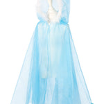 Features: Soft, flowing icy-blue cape with sparkly details. Easy neck closure for quick dress-up. Perfect for costumes, pretend play, or magical gifts. The Souza cape comes with an attached hood and closes at the front with two buttons. The cape includes a narrow feather edge in white around the face opening.