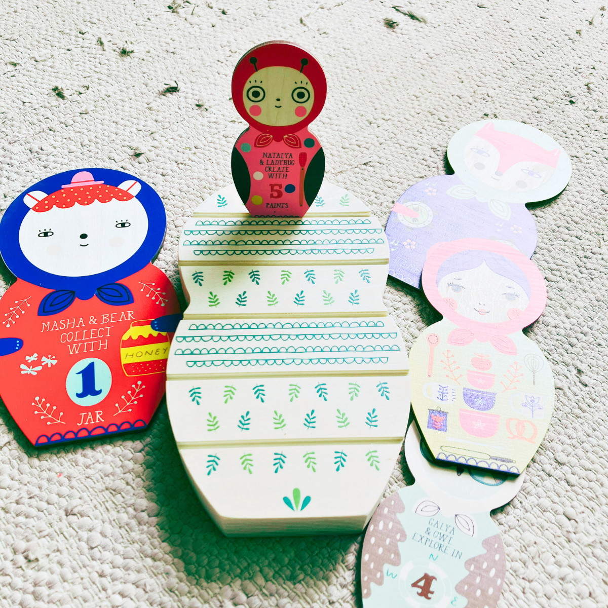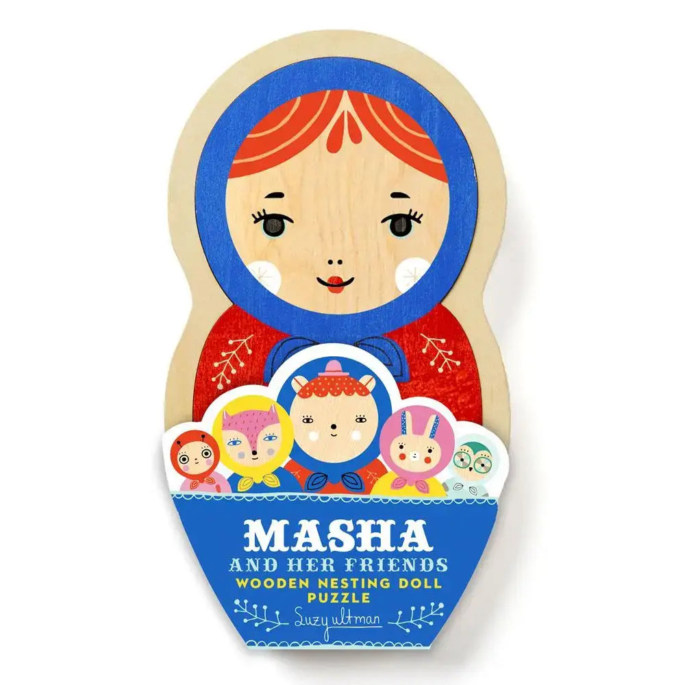 Play and learn with Masha and all of her friends through this delightfully interactive wooden puzzle, beautifully designed by Suzy Ultman. Each piece fits into a corresponding slot that mirrors the classic arrangement of Matryoshka dolls. After all the pieces are assembled, the result is a group of friends that can stand on their own.