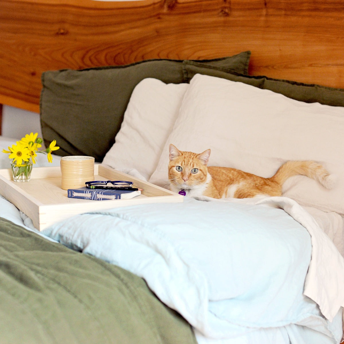 When not in use, our wooden serving tray makes a distinctive addition to a coffee table, ottoman or bar. Walnut, oak, or magnolia is given a hand-applied finish and joined with brass splines into a sturdy, well-crafted object.