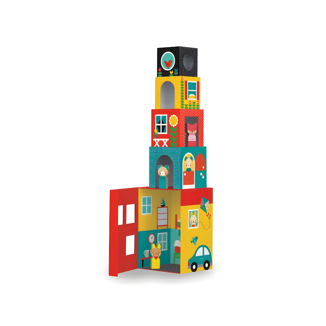 This play set includes four colorful stacking blocks, each designed to create the perfect home for three adorable wooden animal friends.