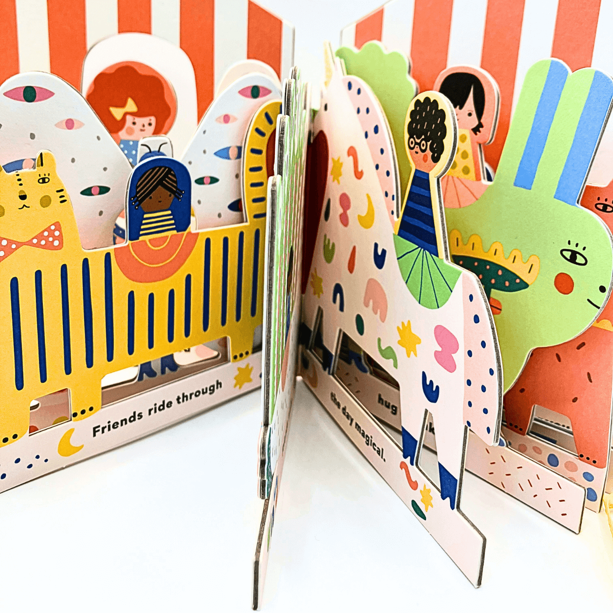 Hop on board! Are you ready to ride? Part board book, part toy, the Friendship Carousel is complete fun! Readers are invited to flip the pages of this playful carousel book for a ride that celebrates friends, both big and small. Then tie the ribbon for merry-go-round fun that never ends!