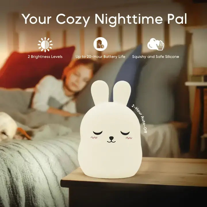 Kids love snuggling Bunny’s soft ears and watching the gentle glow as it “breathes” along with them.