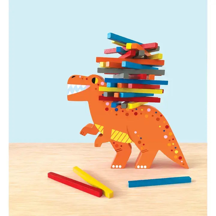 Stack and balance wooden sticks on the back of this brightly colored T-Rex to win the game.