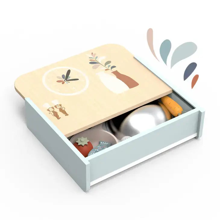 A fun wooden table size version of a kitchen with 8 accessories that your little one can take anywhere. Your talented little Chef can create an entire meal with the stovetop and wash the dishes once done.