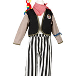 This daring outfit includes classic pirate trousers, a striped top, and a rugged vest, all designed for action-packed adventures. and also with a parrot on his shoulder. he Waistcoat is black with a skull on the left chest. In the edges of the waistcoat and sleeves there are chic gold details. The Trousers are in striped white and black, with a tangled edge in the openings. The Scarf has small checks in white and red.