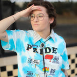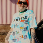 This shirt has significant dates in the American history of LGBTQ+ rights on a blue and white tie-dye shirt.