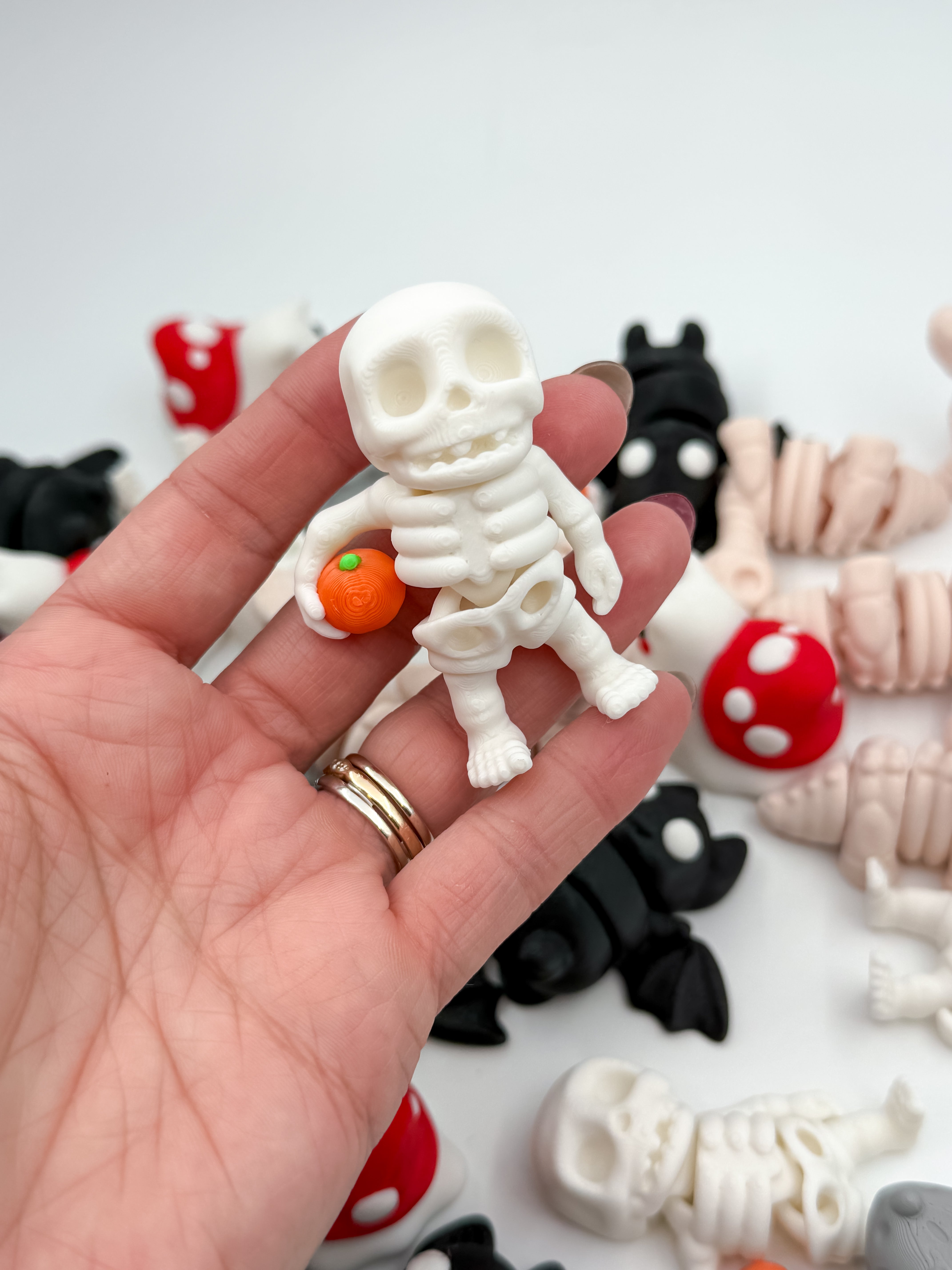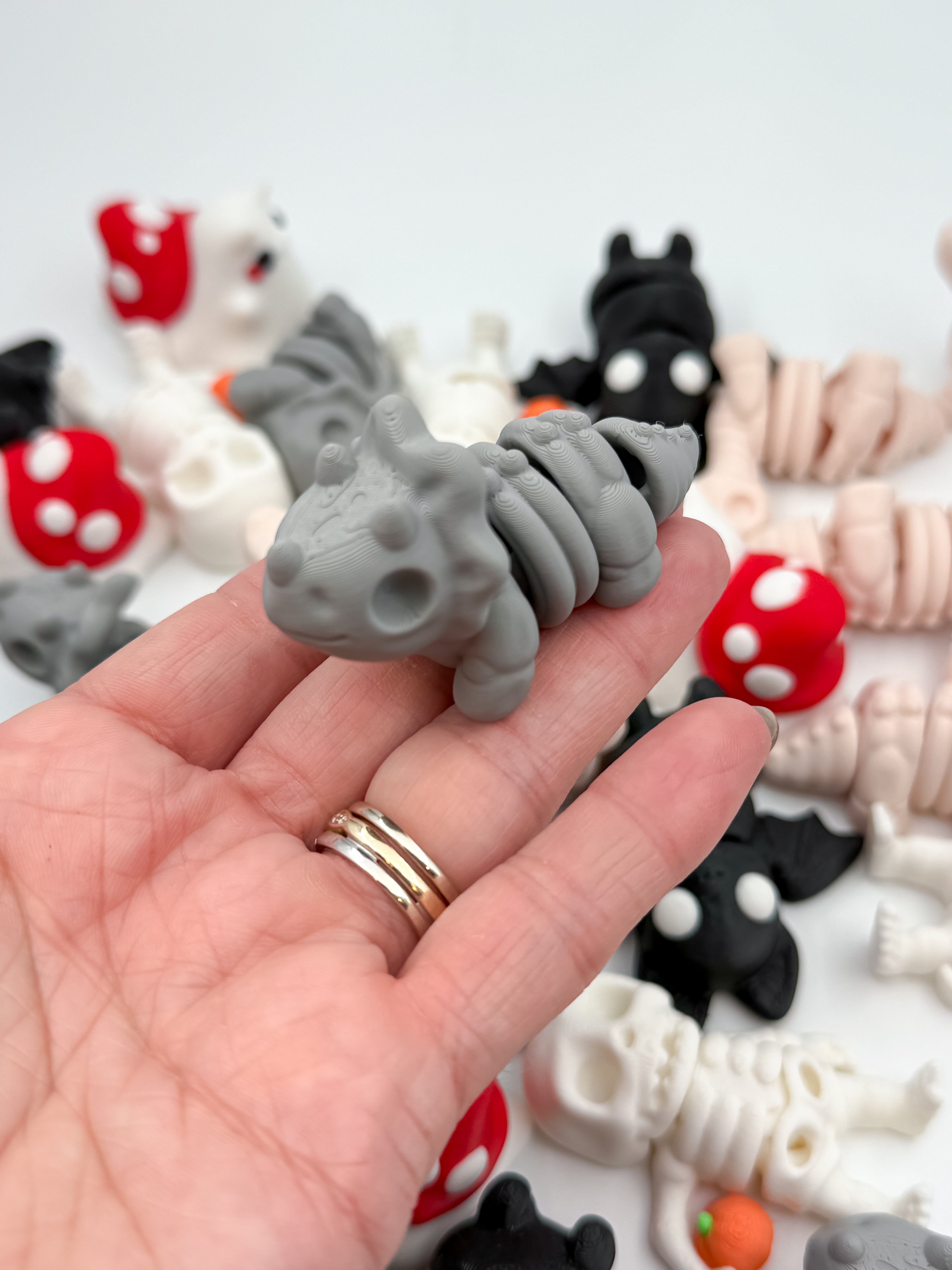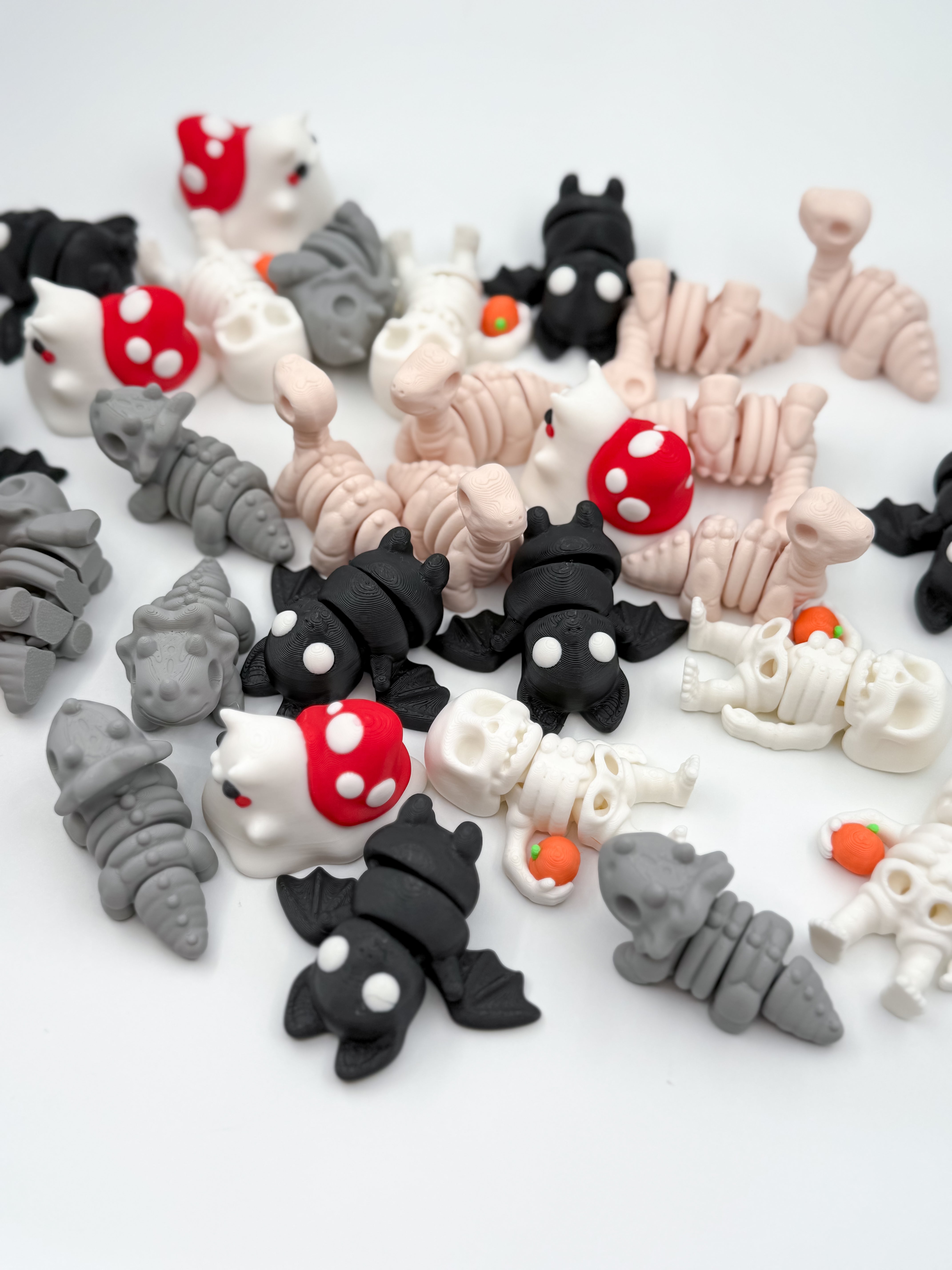 Get ready for spooky season fun with this 3D printed Halloween mystery pack of articulated fidgets! Each pack includes 3 surprise critters—you might receive skeletons, bats, ghosts, mushrooms, or other fall-inspired designs. Every toy is fully articulated for a wiggly, bendy, and fidget-friendly experience that’s as fun to display as it is to play with.