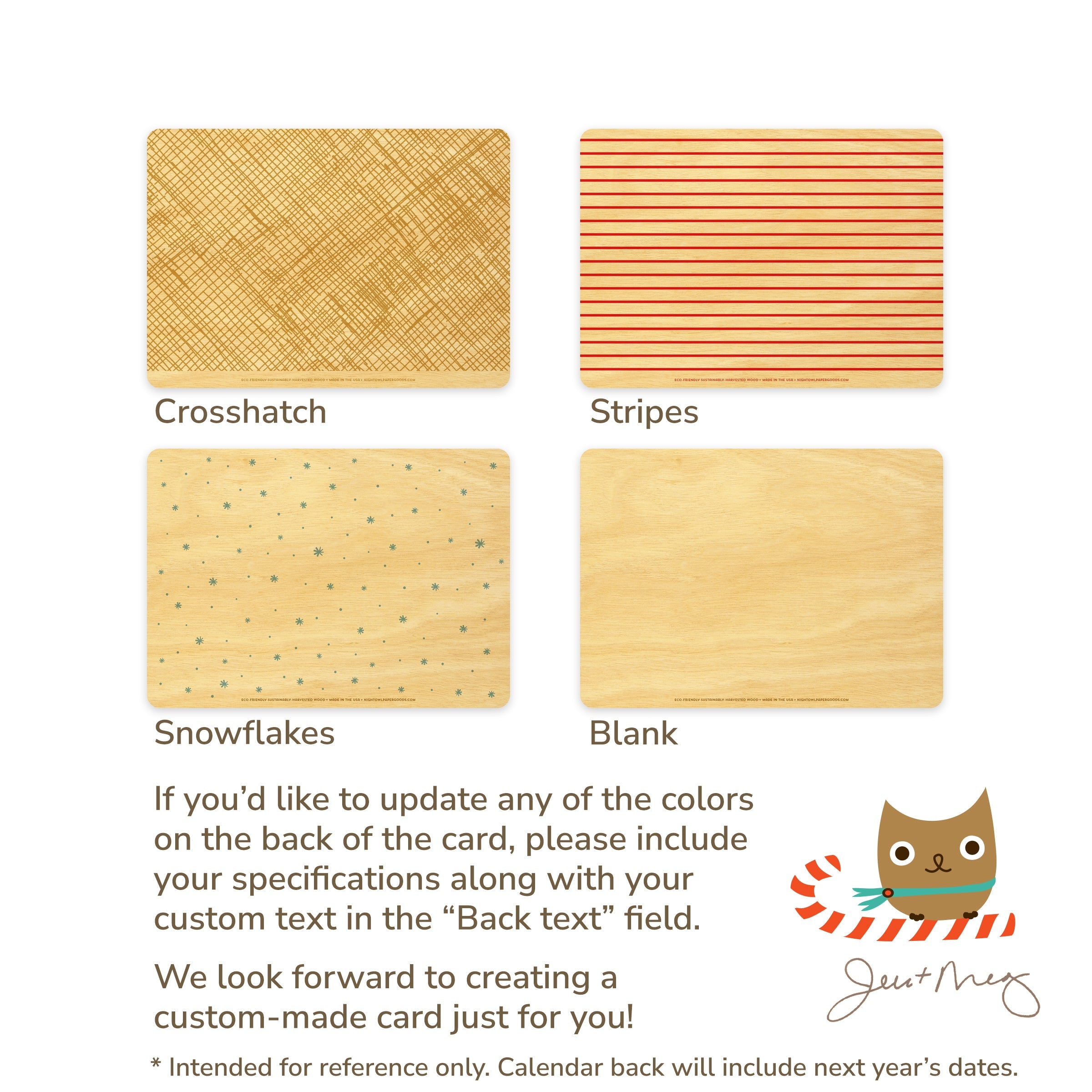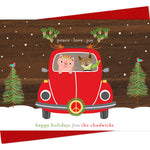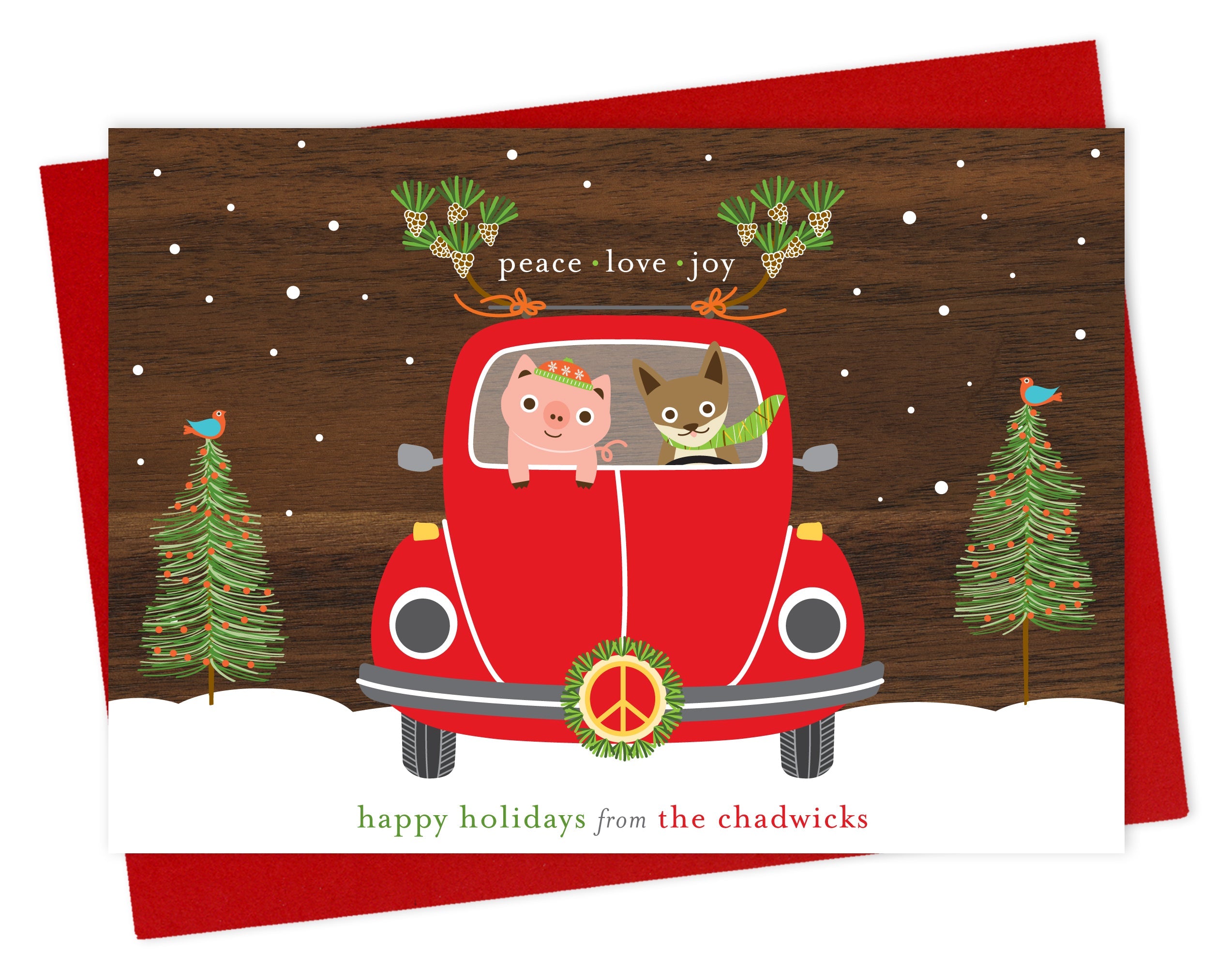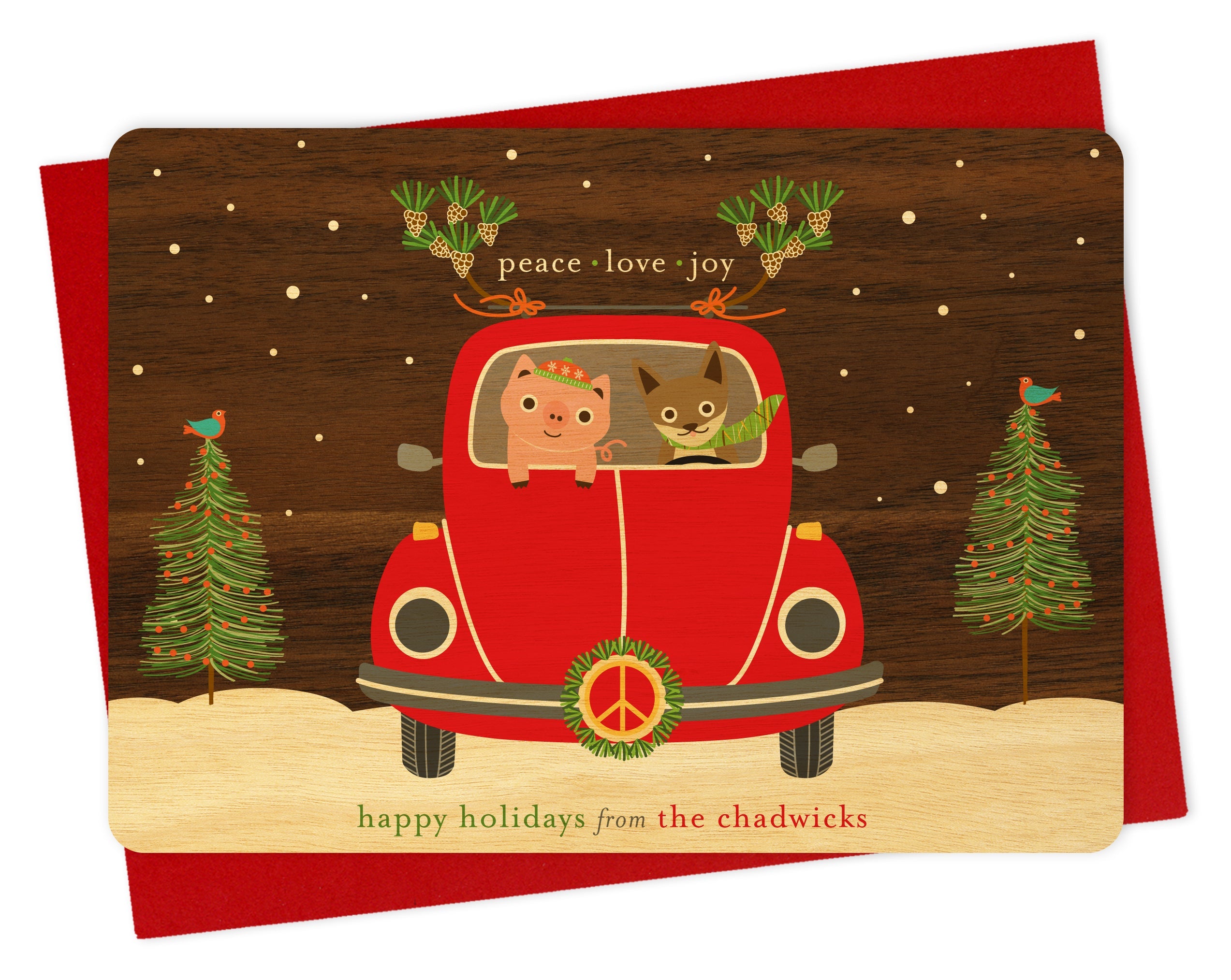 Celebrate the season with our Peace Love Bug holiday cards featuring joyous pig and fox friends cruisin’ in a VW bug with a rich walnut wood grain background. Printed on your choice of real wood or eco-friendly paper, these custom cards are simple to customize with and perfect for sending warm wishes to clients, colleagues and friends. To get started:
