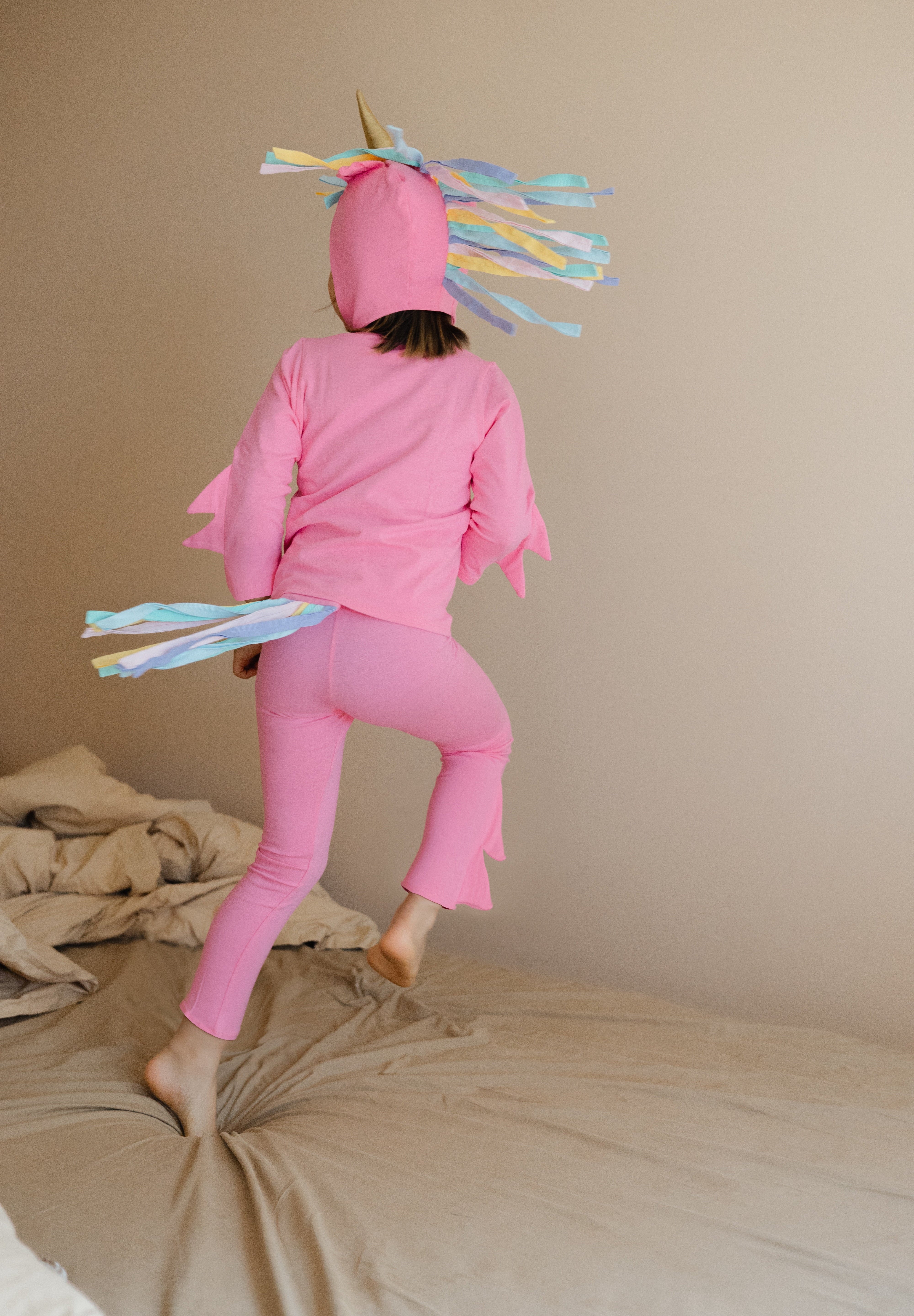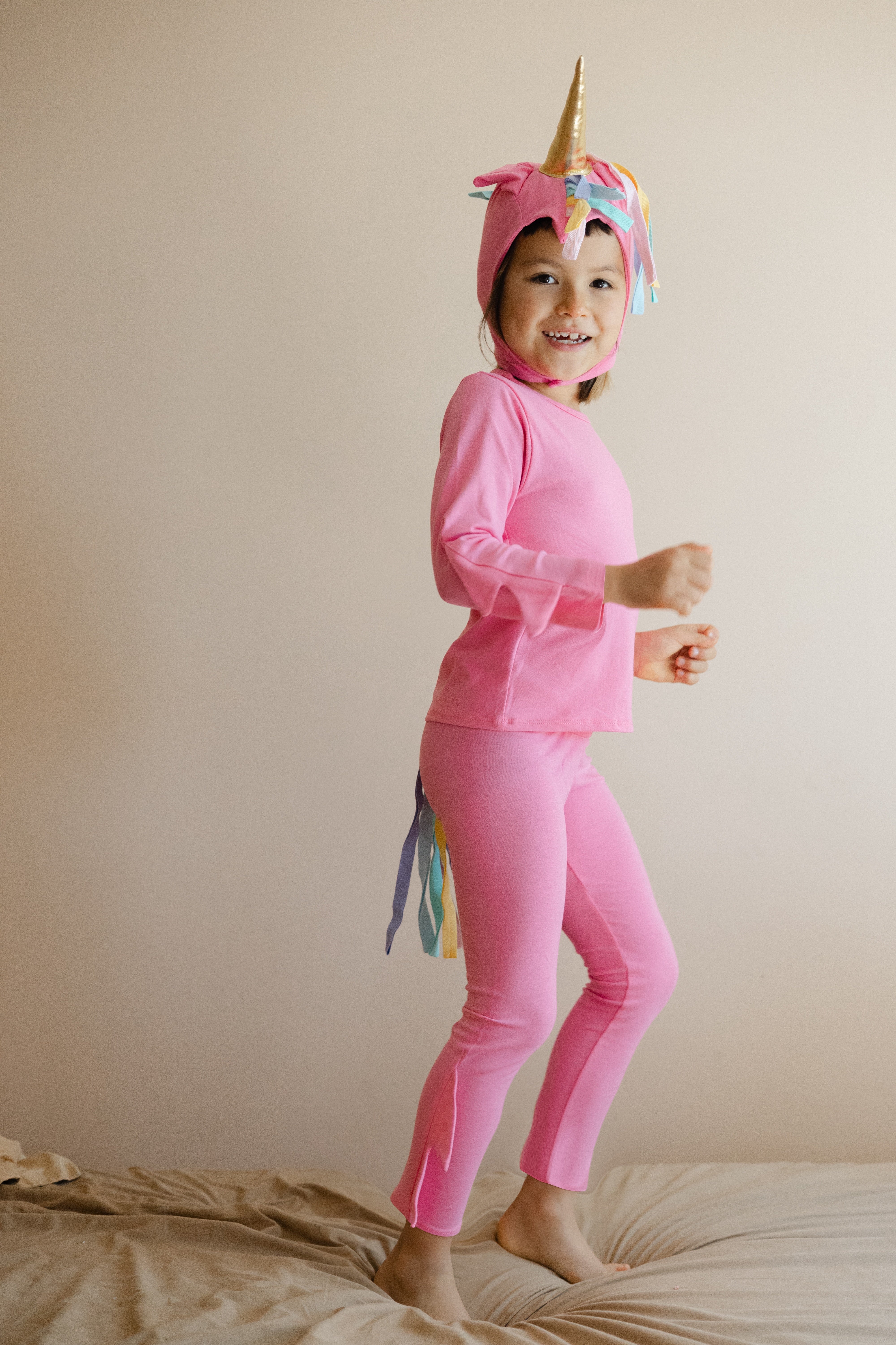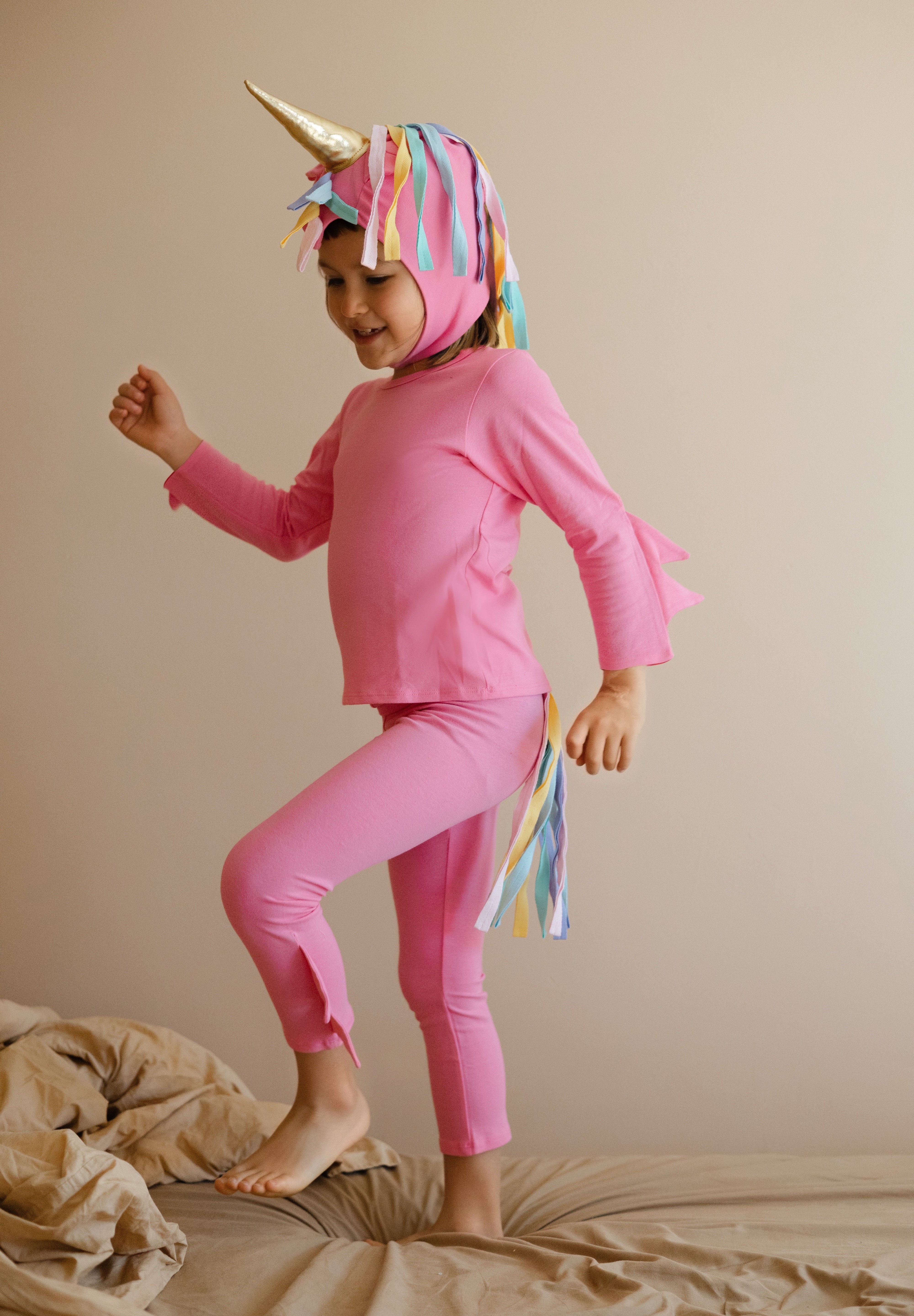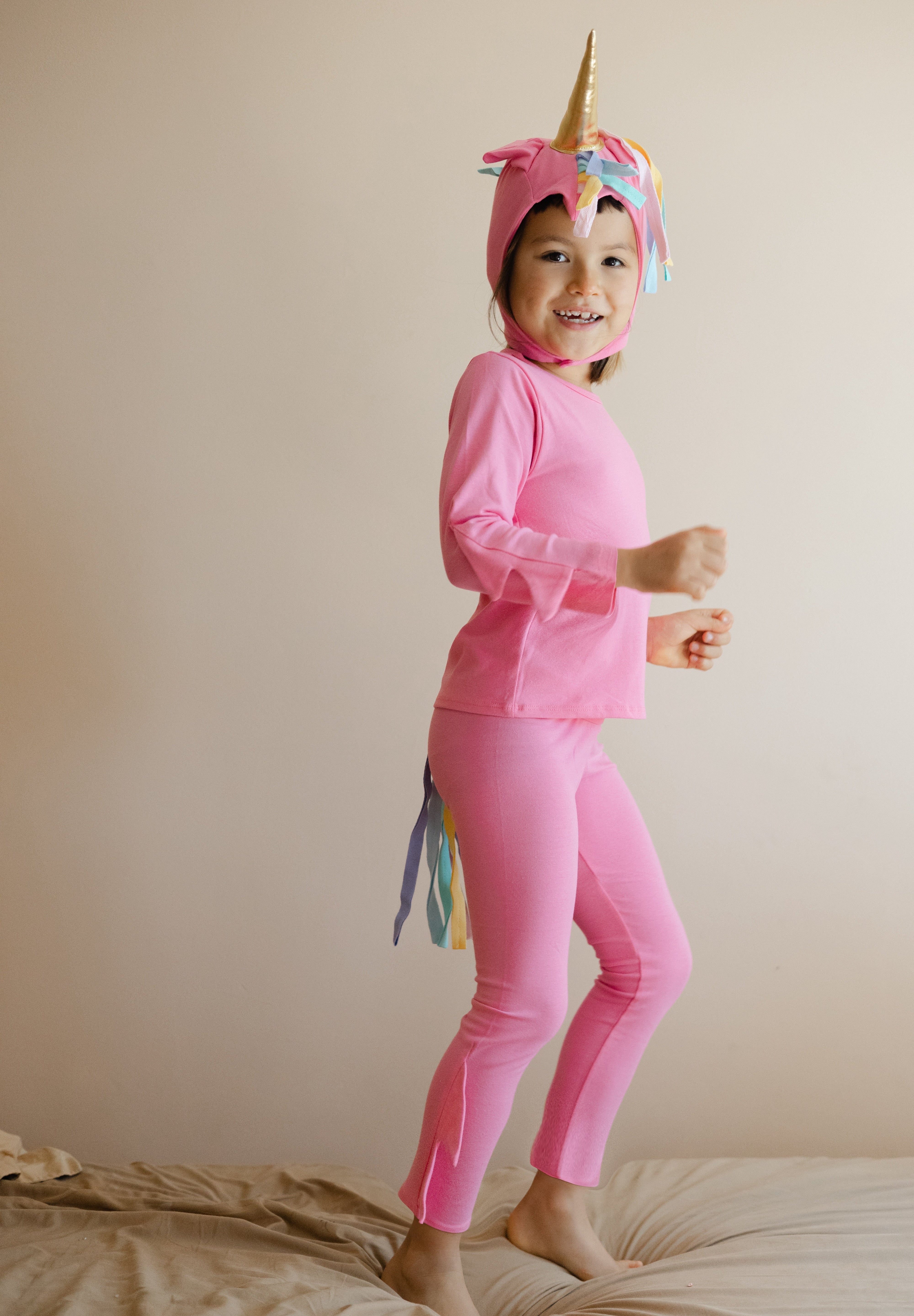 This dreamy pink unicorn pajama costume is pure magic from morning to night. Made from soft, all-cotton fabric, it features a cozy unicorn hat with a secure magnetic snap, a flowing rainbow mane, and a detachable tail with a comfy elastic waistband. Sustainably made in California, it’s gentle on skin, eco-conscious, and perfect for galloping through playtime before curling up for bedtime.