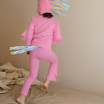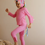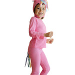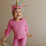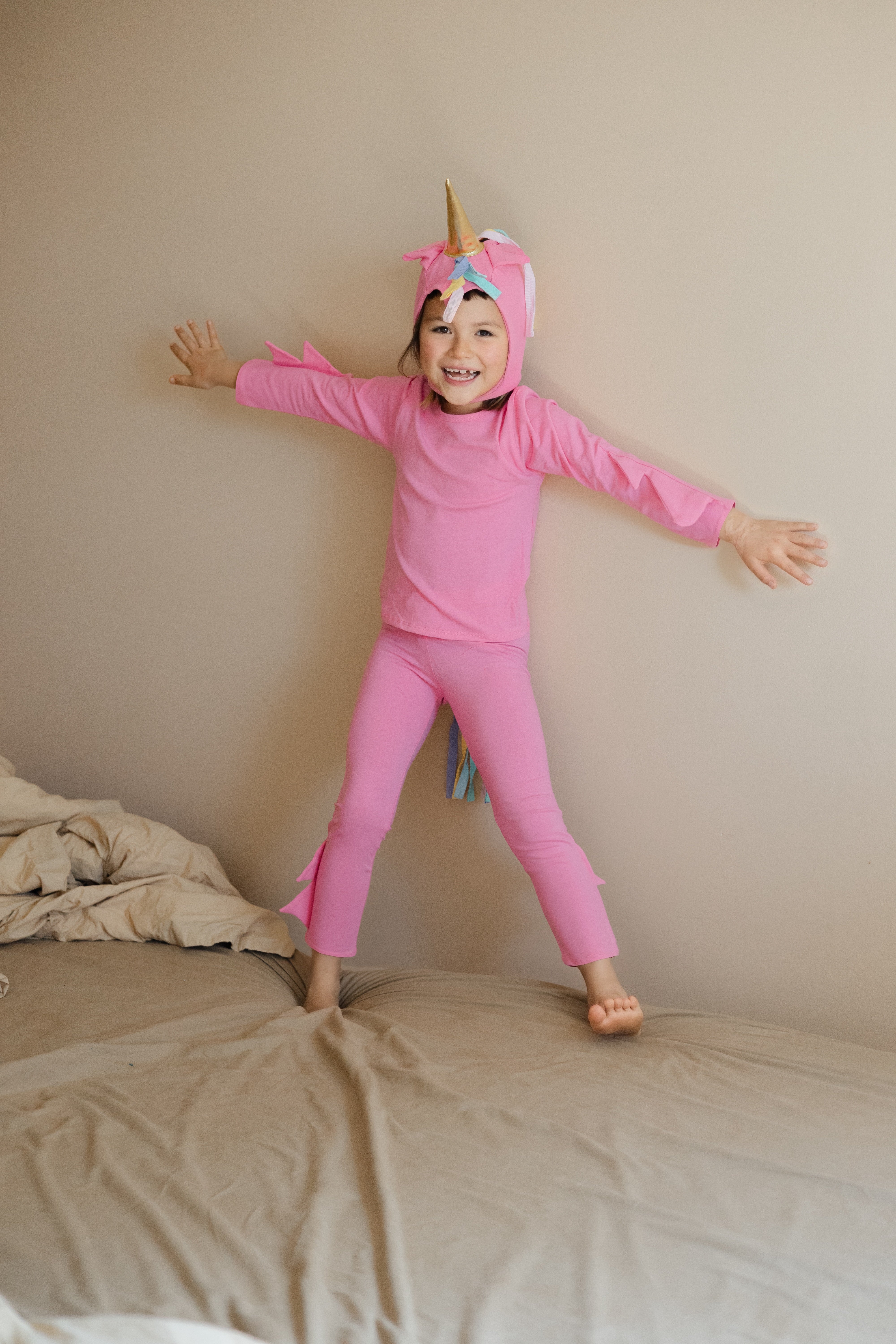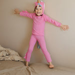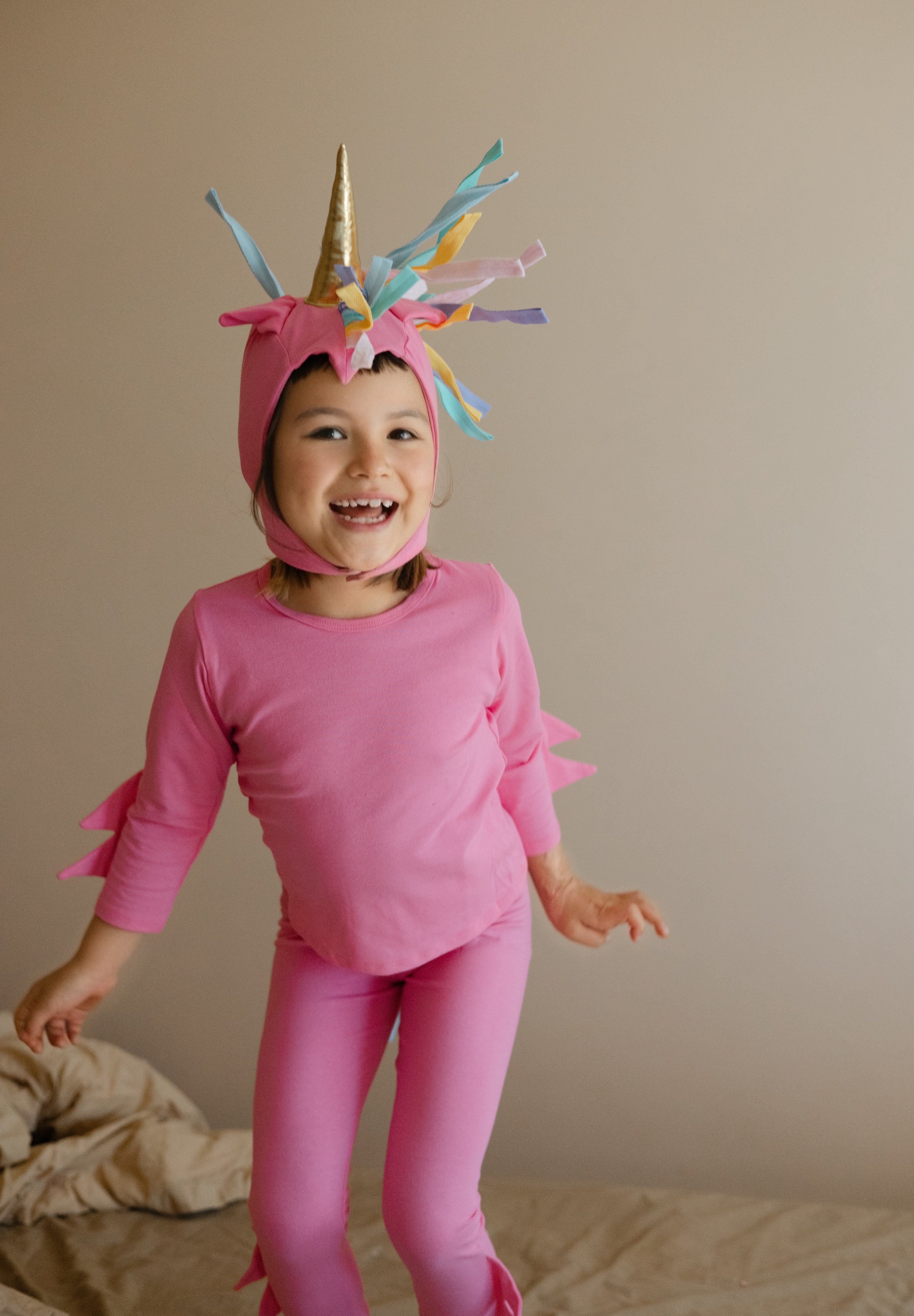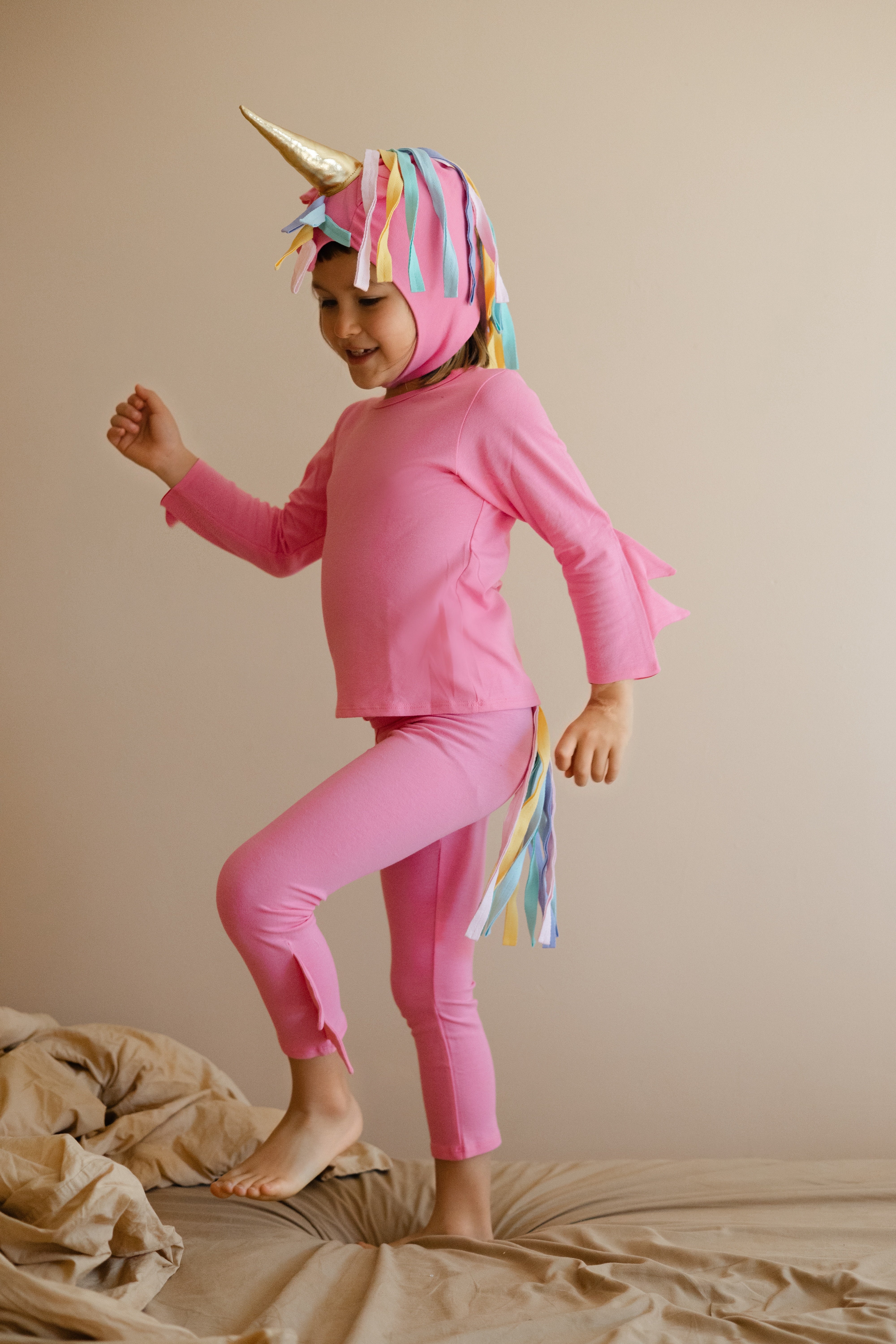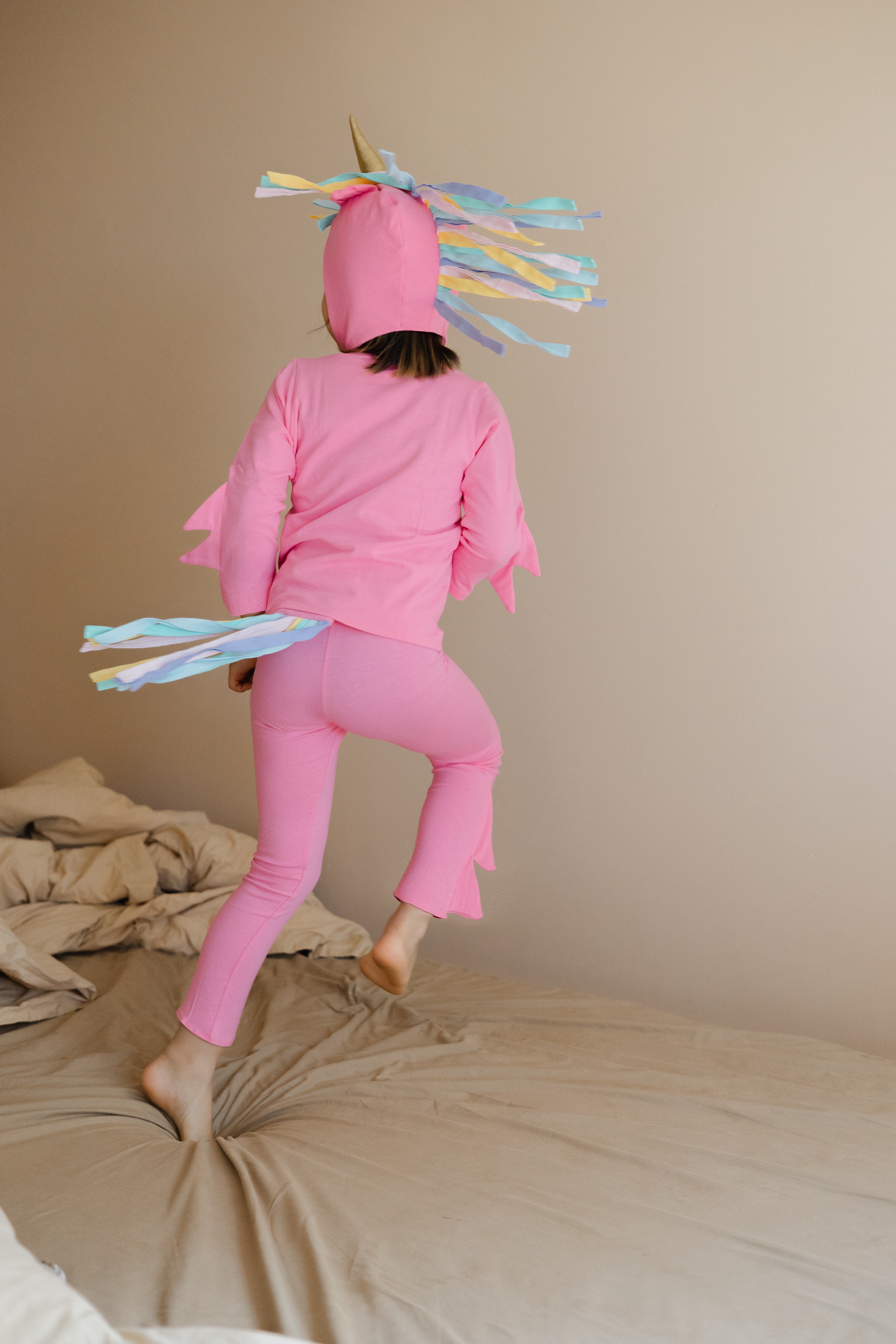This dreamy pink unicorn pajama costume is pure magic from morning to night. Made from soft, all-cotton fabric, it features a cozy unicorn hat with a secure magnetic snap, a flowing rainbow mane, and a detachable tail with a comfy elastic waistband. Sustainably made in California, it’s gentle on skin, eco-conscious, and perfect for galloping through playtime before curling up for bedtime.