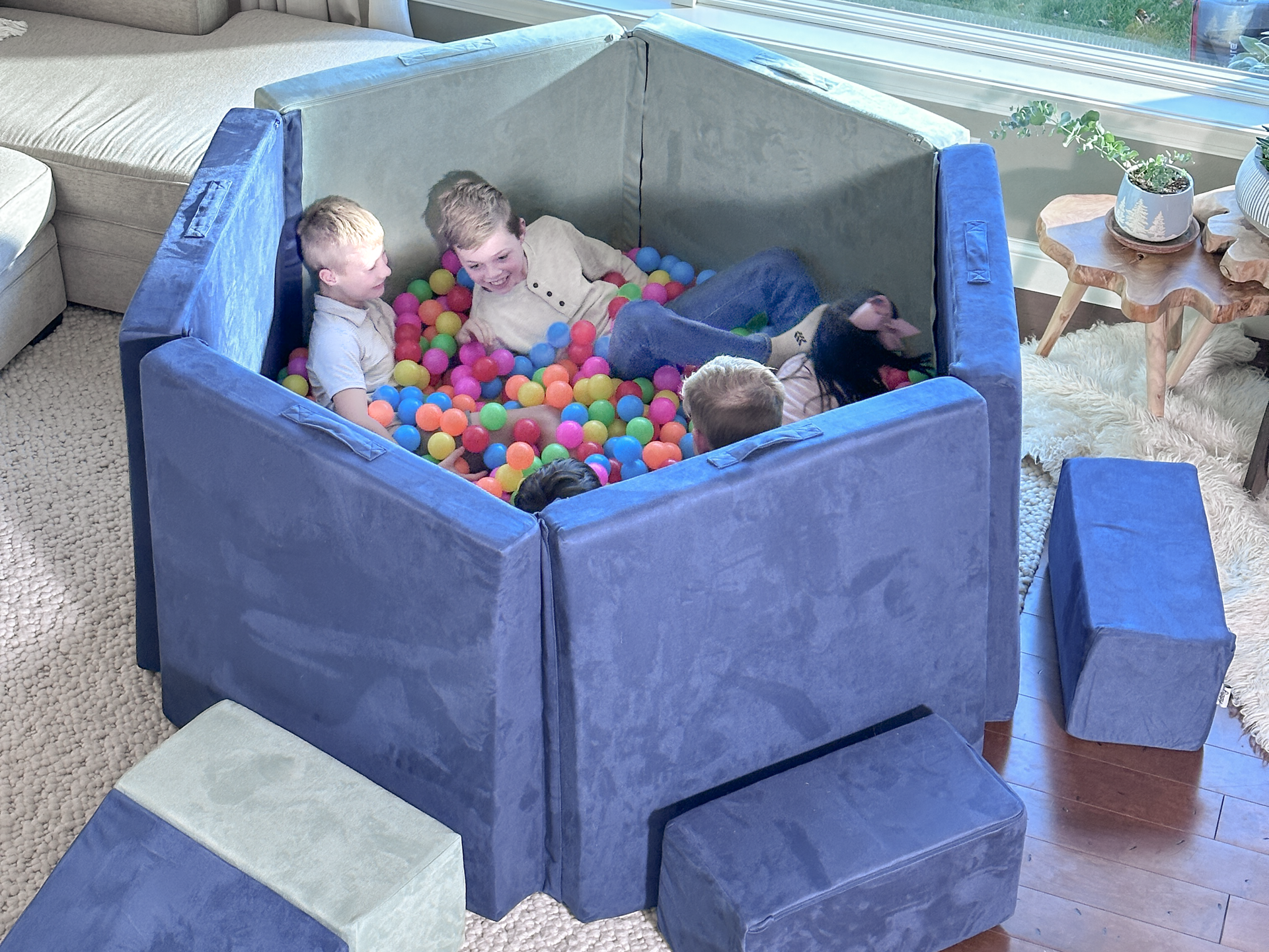 With two extra large square cushions, equipped with our clever Velcro system, watch as your little architects build bigger and bolder. Ramp up the fun with extended slides, construct colossal castles, or dive into even deeper ball pits – the only limit is the sky above!